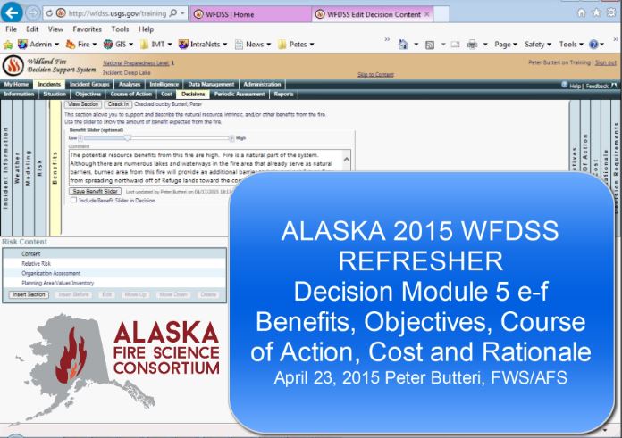 Training modules on using the Wildland Fire Decision Support System (WFFDSS) in Alaska are now available on the AFSC website. Find a video, from 5 to 30 minutes long, on the section you’re interested in or download a step-by-step annotated Powerpoint taking you all the way from Login to Publishing a decision.