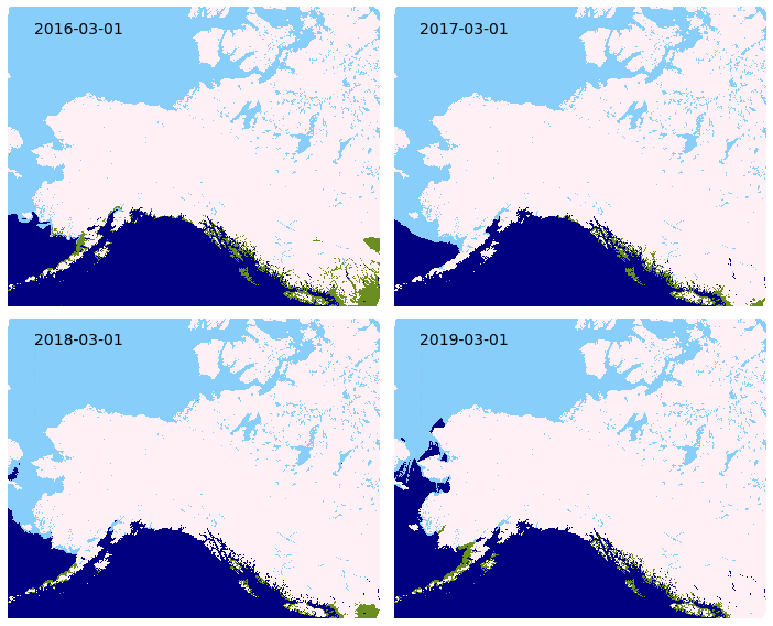 Figure 1. Inter-annual comparison of snow melt across Alaska and northwest Canada, 2016-2019. Green regions represent snow free areas. This animated comparison is just one way the data snow cover data can be visualized. The snow cover data can be obtained as a vector file, allowing for fine-scale pattern analysis within smaller geographic extents.