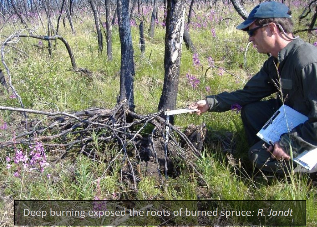 Post-fire succession: When Alaska spruce forests burn the trees are killed, but black spruce stands tend to “self-replace” about ⅔ of the time—by seeding into the remnant moss layers2. On the other hand, it has been well-documented that “severe” (deep-burning) forest fires favor regrowth of hardwoods (birch, aspen and poplar). These species can grow fast in deeper active layers that result after severe fires in which most of the moss duff is removed3. This can result in a “relay succession” recovery where hardwoods dominate the canopy for a time before slower growing spruce can regain dominance of the canopy. In either case, if the stand reburns within about 50 years, small black spruce in the understory are destroyed before developing a robust seed bank, and the stands tend to become increasingly hardwood dominated. Ongoing studies to refine these parameters in eastern interior Alaska reveal that pure black spruce stands transitioned to deciduous forest about half the time after a severe fire4. Coniferous forest with even a small percentage of deciduous stems (> 7%) succeeded into a mixed-wood composition (50:50) and stands which had >30% pre-fire deciduous stems became exclusively deciduous.