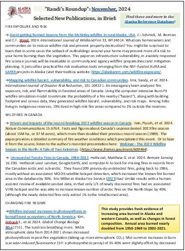 Download the latest Roundup with brief highlights of new publications that may interest the Alaska fire science and management community HERE. The fall Roundup includes links to articles on improvements in ranking fire risk around communities and structures, new findings on changes in fire regime in Alaska and Canada, implications of increases in high latitude fire on the atmosphere, and interesting findings on toxic components in fire retardant chemicals. Here’s the URL to a downloadable version: